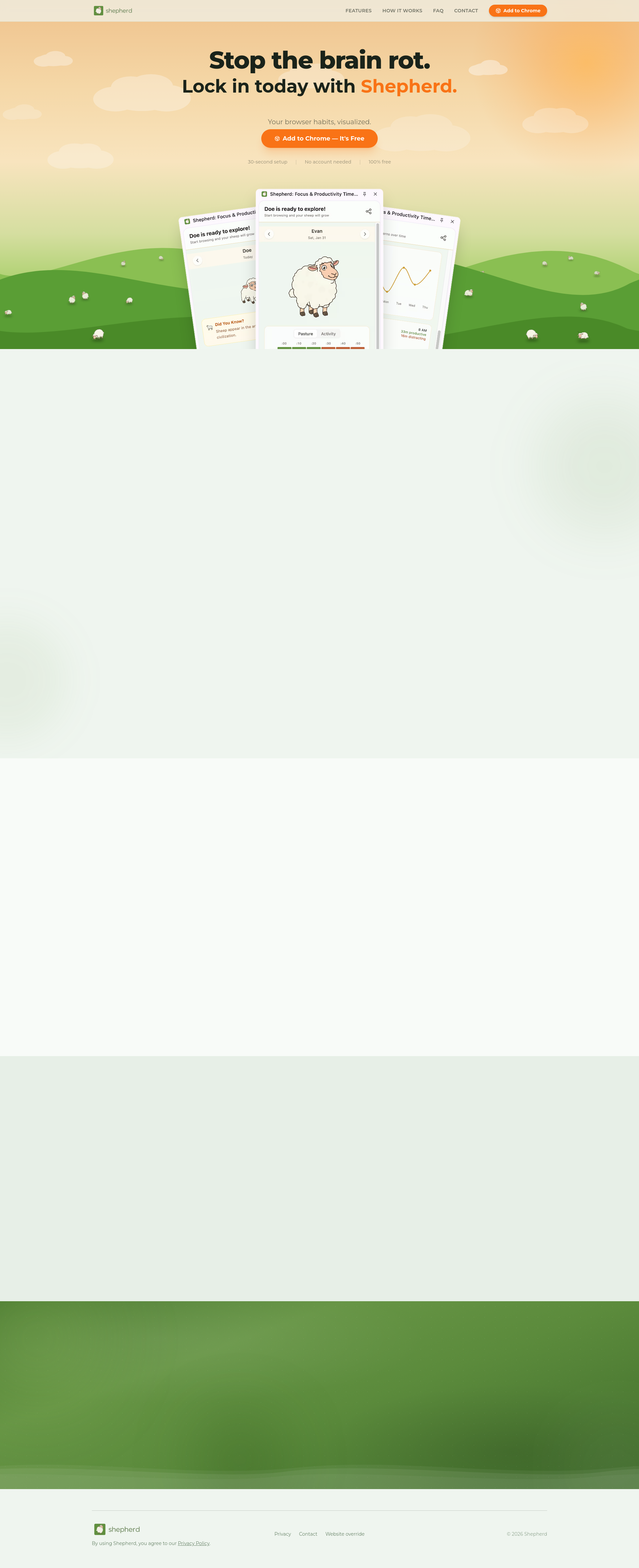 Shepherd works by installing the Chrome extension with a single click, requiring no account creation. Once installed, it runs passively while you browse normally, automatically categorizing every site you visit. The system then displays your productivity trends, top sites visited, and your evolving sheep character in a single dashboard panel.